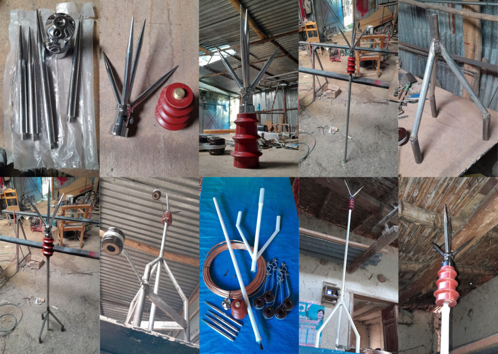 Es el dispositivo principal del sistema, consta de una punta dirigida hacia arriba y 3 puntas dirigidas hacia abajo, unidas en una esfera de cobre barnizada con platina, esta esfera permanece unida al aislador y este a la vez al pastoral, es de tipo Franklin y el principio de funcionamiento es el siguiente, cuando las nubes cargadas y a punto de producir una descarga eléctrica están cerca al puntal, este atraerá a la descarga y lo conducirá a tierra ya que todo este sistema ofrece una menor resistencia, protegiendo así a los equipos electrónicos instalados en la torre. Todos estos equipos los adquirimos en Lima.