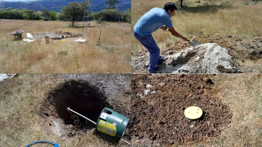 Una vez terminado de excavar el pozo procedemos a colocar la varilla de cobre (5/8) unida con una espiral de cobre enrollada de punta a punta, a la vez tenemos los materiales de la mezcla para rellenar el pozo, se necesita 2 bolsas de Bentonita mezclada con la tierra de chacra, guano de ovino y agua, el proceso es el siguiente, vertimos agua a la base del pozo hasta una altura de 20 cm, y vamos agregando las mezcla de materiales hasta observar una masa uniforme, luego nuevamente roseamos agua y mezcla y así sucesivamente hasta llenar el pozo, una vez lleno colocar una capa de tierra de chacra alrededor del plástico protector de la conexión y asegurarlo para que no se mueva.